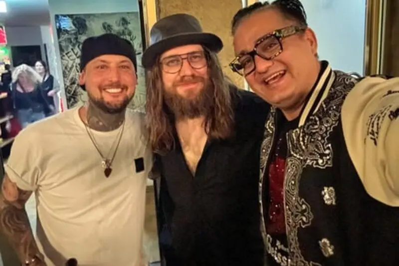 Die erfolgreiche Ruhrgebiets-Band „Kuult“ startete ihre „Ohne Strom“-Tour in der Kunst- & Kultur-Galerie S-ART. Das Konzert war restlos ausverkauft, die Fans waren hellauf begeistert. Darunter auch Essens Oberbürgermeister Thomas Kufen. Das Foto zeigt „Kuult“-Frontmann Chris Werner (l.) mit dem Bassisten Christian de Crau und dem Künstler, Architekten und Galeristen Sharyar „Shary“ Azhdari - © Shary Azhdari