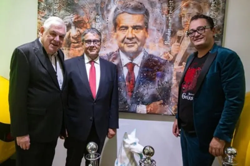 Die STADTGESPRÄCHE.ruhr waren zu Gast in der Kunst- & Kultur-Galerie S-ART. Rund 180 Entscheiderinnen und Entscheider aus Politik, Wirtschaft, Sport und Kultur wurden von Azadeh und Shary Azhdari willkommen geheißen. Interessiert und gebannt verfolgten die Teilnehmer das Gespräch, das Moderator Jürgen Zurheide mit Impulsgast Sigmar Gabriel, Ex-Außenminister und Ex-Vizekanzler, führte. Der prominente SPD-Politiker bezog auch klar Stellung zu Putins Angriffskrieg in der Ukraine. Gemeinsam mit Dr. Richard Kiessler (l.), Initiator der STADTGESPRÄCHE.ruhr, bestaunte Sigmar Gabriel (M.) das Kunstwerk, das Künstler und Architekt Sharyar „Shary“ Azhdari (r.) von ihm geschaffen hat. © Foto: Fotostudio Essen / Dr. Claudia Posern